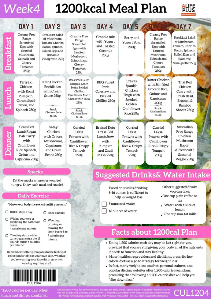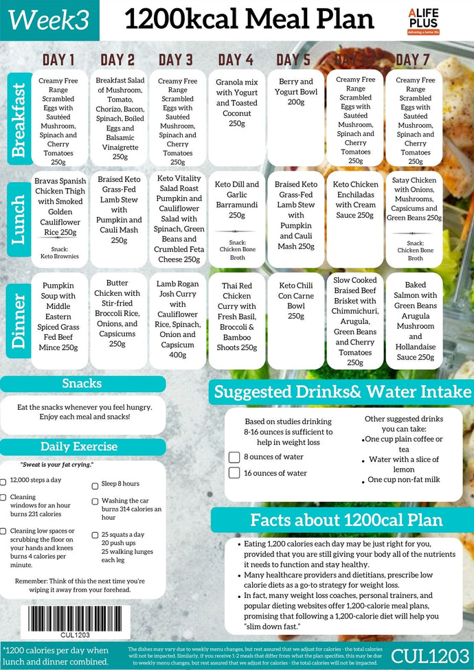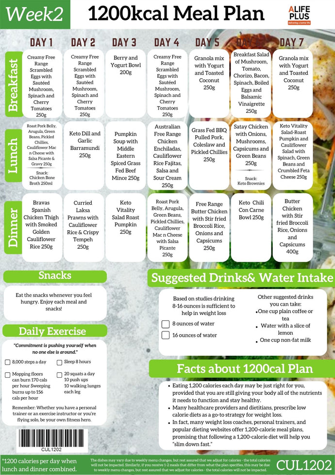 With a daily caloric intake of approximately 1200 calories, this program is ideal for those seeking steady weight loss, weight management, an active lifestyle.
